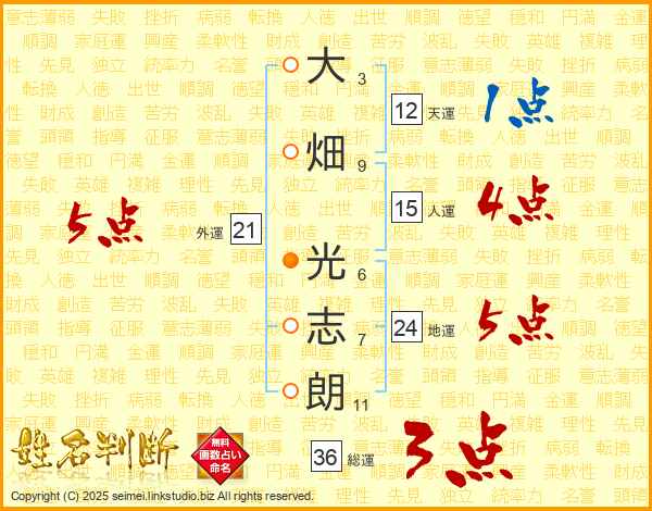 大(3画)畑(9画) 光(6画)志(7画)朗(11画)