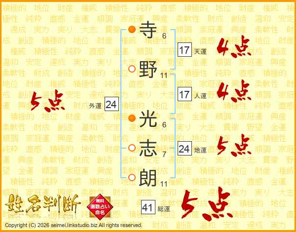 寺(6画)野(11画) 光(6画)志(7画)朗(11画)