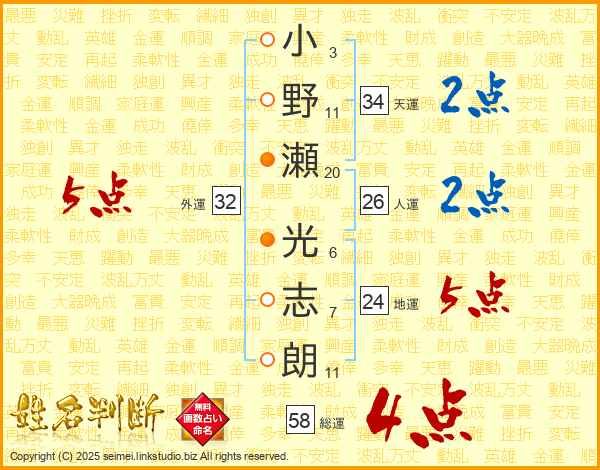 小(3画)野(11画)瀬(20画) 光(6画)志(7画)朗(11画)