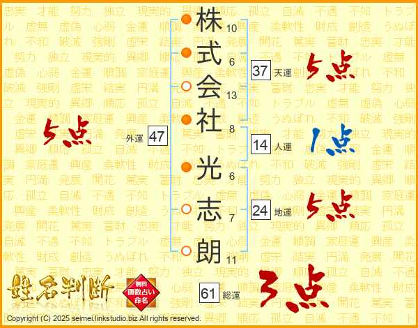 株(10画)式(6画)会(13画)社(8画) 光(6画)志(7画)朗(11画)
