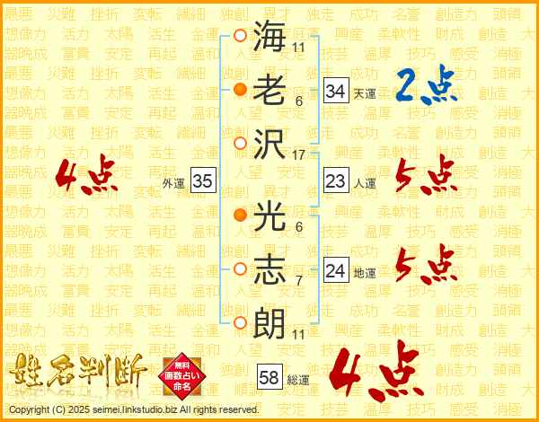 海(11画)老(6画)沢(17画) 光(6画)志(7画)朗(11画)