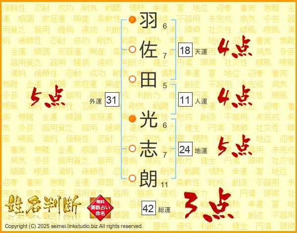 羽(6画)佐(7画)田(5画) 光(6画)志(7画)朗(11画)