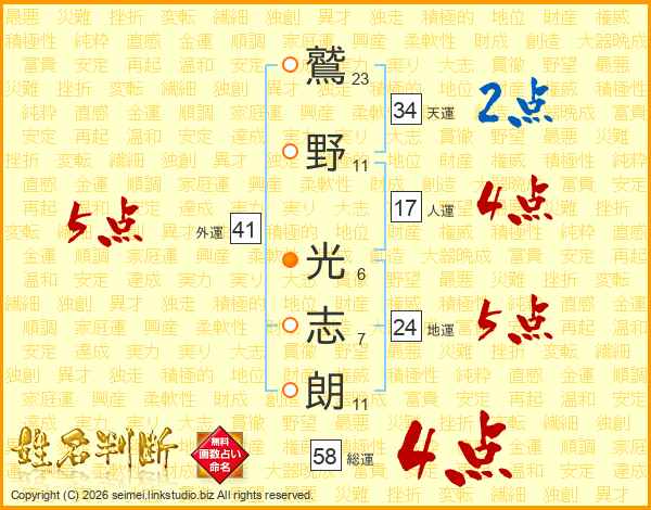 鷲(23画)野(11画) 光(6画)志(7画)朗(11画)