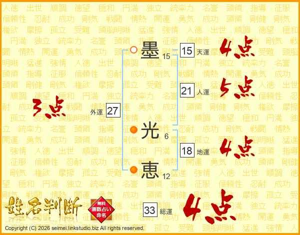 家系が持つ宿命的な運勢を表します。祖先から受け継いだ苗字ですので自分の力が及びません。家柄を象徴します。苗字の合計画数。