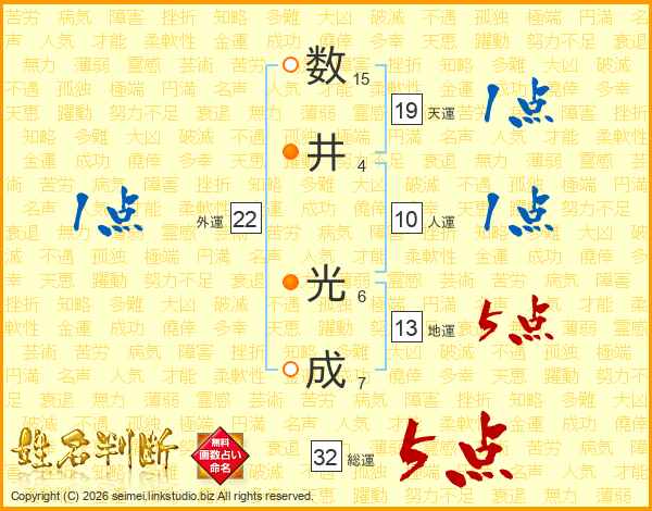 あなたの人生を表す1番重要な運勢です。生涯を通じて影響する総合運となり、主に50歳以降の晩年期に影響を及ぼします。苗字と名前の合計画数。