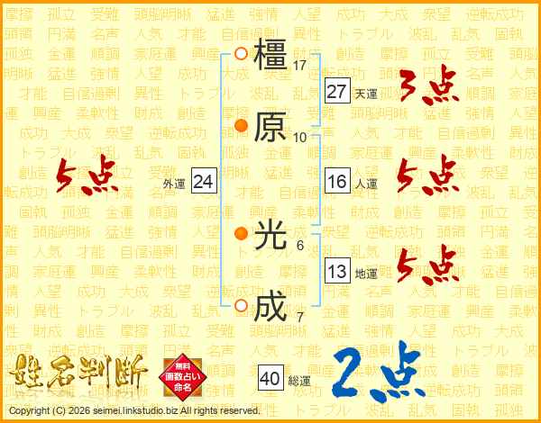 橿原光成さんの地運は13画の5点!