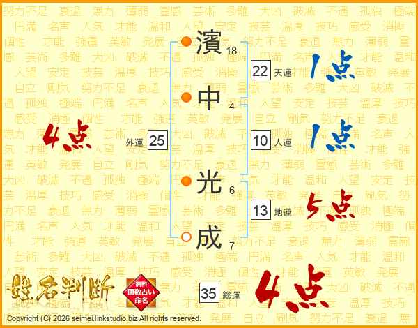 濱(18画)中(4画) 光(6画)成(7画)