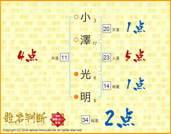 小(3画)澤(17画) 光(6画)明(8画)