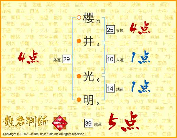あなたの人生を表す1番重要な運勢です。生涯を通じて影響する総合運となり、主に50歳以降の晩年期に影響を及ぼします。苗字と名前の合計画数。