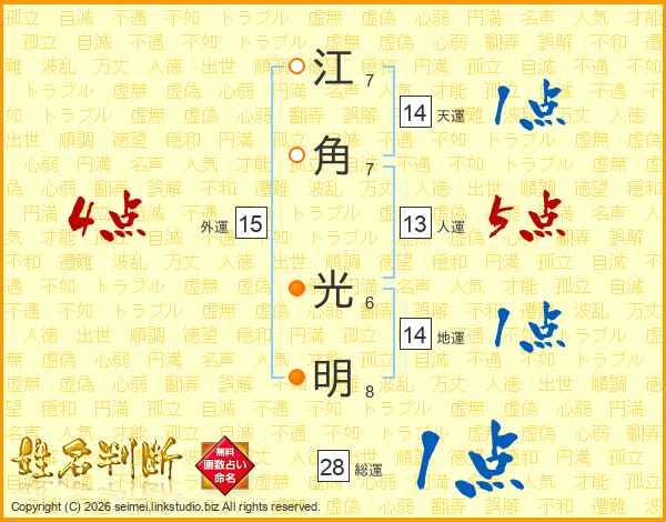 画数の奇数(○陽)と偶数(●陰)の配列で吉凶を占います。どちらかにかたよる名前は大凶名で避ける必要があります。画数の奇数偶数。