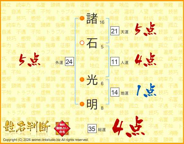 あなたの人生を表す1番重要な運勢です。生涯を通じて影響する総合運となり、主に50歳以降の晩年期に影響を及ぼします。苗字と名前の合計画数。