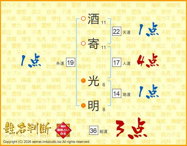 生活面を象徴する運勢です。外部から受ける影響力を表し、結婚運、家庭運や職場、環境への順応性を表します。総運から人運を引いた画数。姓や名が1文字の場合を除く。