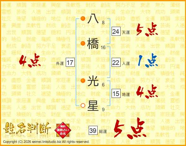 家系が持つ宿命的な運勢を表します。祖先から受け継いだ苗字ですので自分の力が及びません。家柄を象徴します。苗字の合計画数。