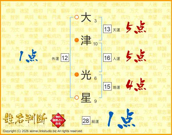 あなたの人生を表す1番重要な運勢です。生涯を通じて影響する総合運となり、主に50歳以降の晩年期に影響を及ぼします。苗字と名前の合計画数。