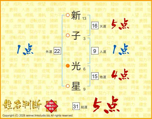 生活面を象徴する運勢です。外部から受ける影響力を表し、結婚運、家庭運や職場、環境への順応性を表します。総運から人運を引いた画数。姓や名が1文字の場合を除く。