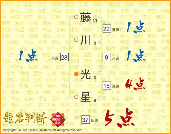 生活面を象徴する運勢です。外部から受ける影響力を表し、結婚運、家庭運や職場、環境への順応性を表します。総運から人運を引いた画数。姓や名が1文字の場合を除く。