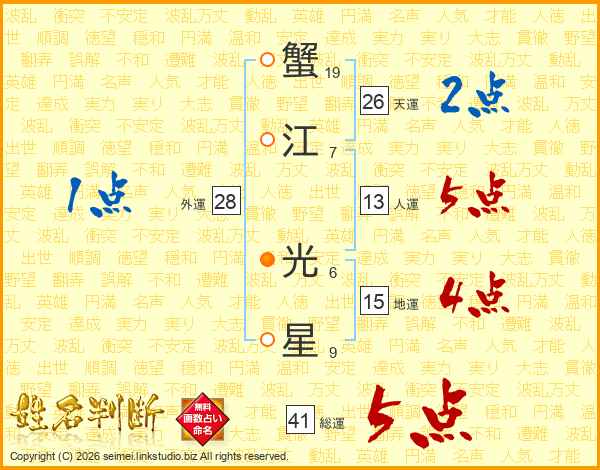 画数の奇数(○陽)と偶数(●陰)の配列で吉凶を占います。どちらかにかたよる名前は大凶名で避ける必要があります。画数の奇数偶数。