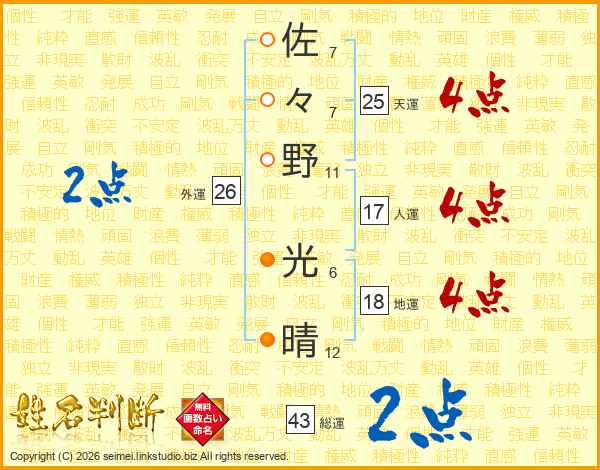 佐(7画)々(7画)野(11画) 光(6画)晴(12画)