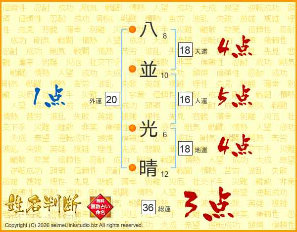 生活面を象徴する運勢です。外部から受ける影響力を表し、結婚運、家庭運や職場、環境への順応性を表します。総運から人運を引いた画数。姓や名が1文字の場合を除く。