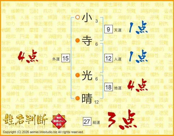 あなたの人生を表す1番重要な運勢です。生涯を通じて影響する総合運となり、主に50歳以降の晩年期に影響を及ぼします。苗字と名前の合計画数。