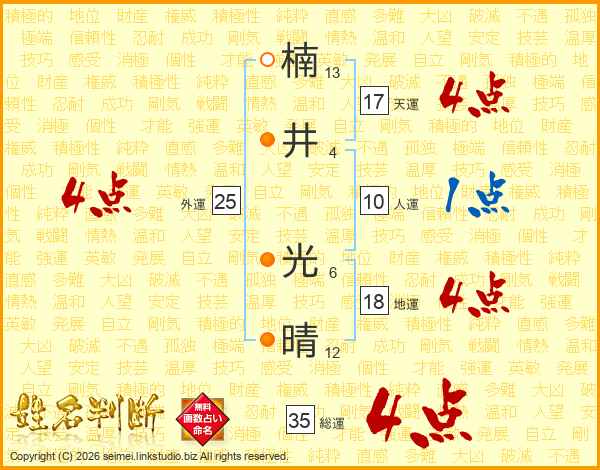 楠(13画)井(4画) 光(6画)晴(12画)