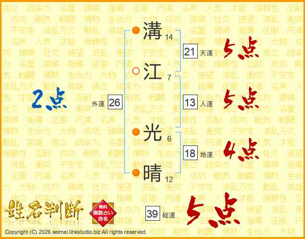 生活面を象徴する運勢です。外部から受ける影響力を表し、結婚運、家庭運や職場、環境への順応性を表します。総運から人運を引いた画数。姓や名が1文字の場合を除く。
