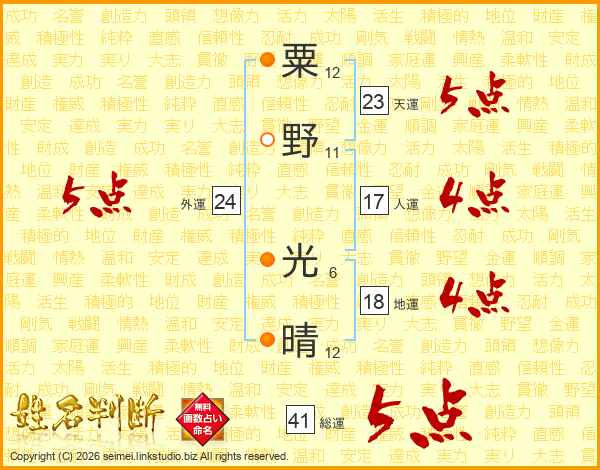 粟野光晴さんの総運は41画の5点!