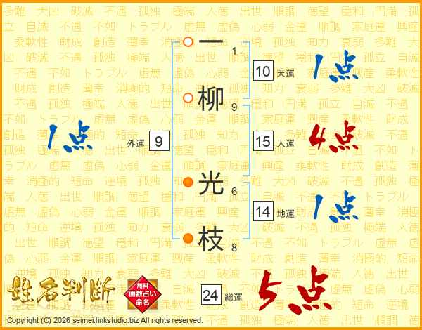 生活面を象徴する運勢です。外部から受ける影響力を表し、結婚運、家庭運や職場、環境への順応性を表します。総運から人運を引いた画数。姓や名が1文字の場合を除く。