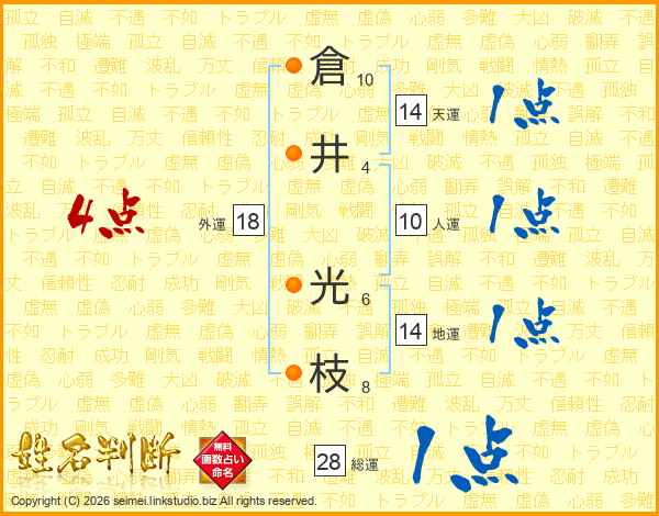 倉(10画)井(4画) 光(6画)枝(8画)