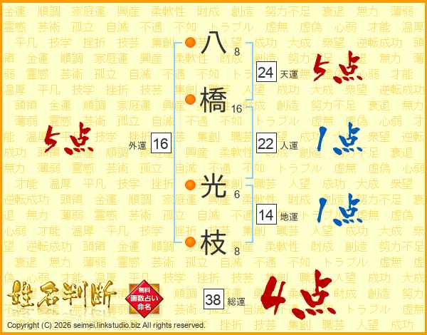 生活面を象徴する運勢です。外部から受ける影響力を表し、結婚運、家庭運や職場、環境への順応性を表します。総運から人運を引いた画数。姓や名が1文字の場合を除く。