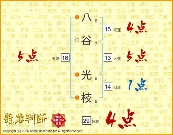 生活面を象徴する運勢です。外部から受ける影響力を表し、結婚運、家庭運や職場、環境への順応性を表します。総運から人運を引いた画数。姓や名が1文字の場合を除く。