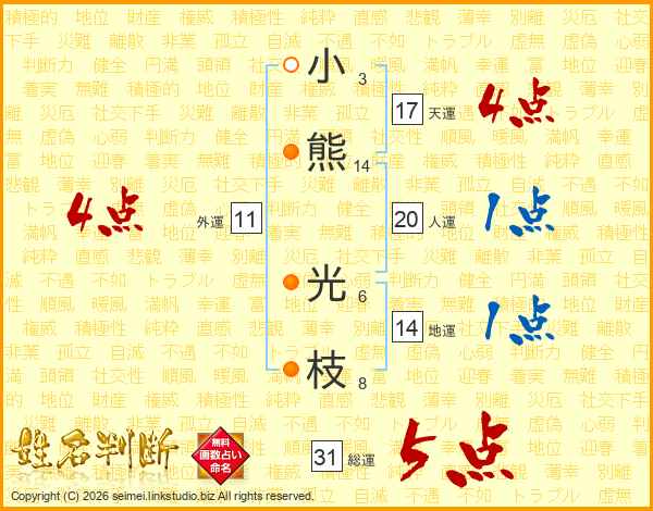 生活面を象徴する運勢です。外部から受ける影響力を表し、結婚運、家庭運や職場、環境への順応性を表します。総運から人運を引いた画数。姓や名が1文字の場合を除く。