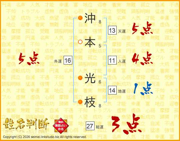 あなたの人生を表す1番重要な運勢です。生涯を通じて影響する総合運となり、主に50歳以降の晩年期に影響を及ぼします。苗字と名前の合計画数。