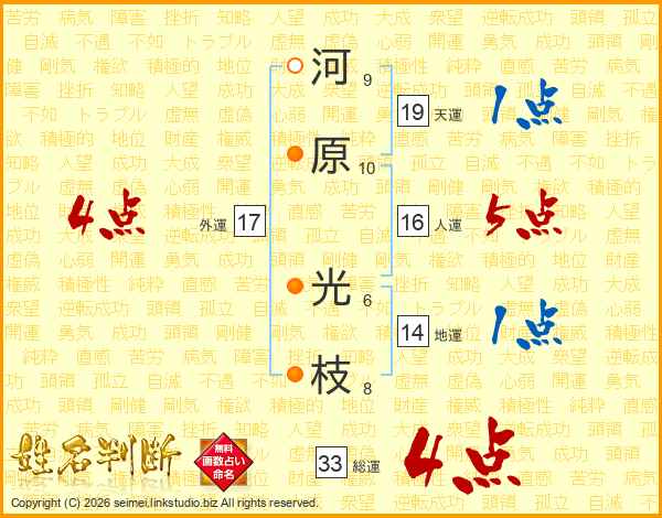 生活面を象徴する運勢です。外部から受ける影響力を表し、結婚運、家庭運や職場、環境への順応性を表します。総運から人運を引いた画数。姓や名が1文字の場合を除く。