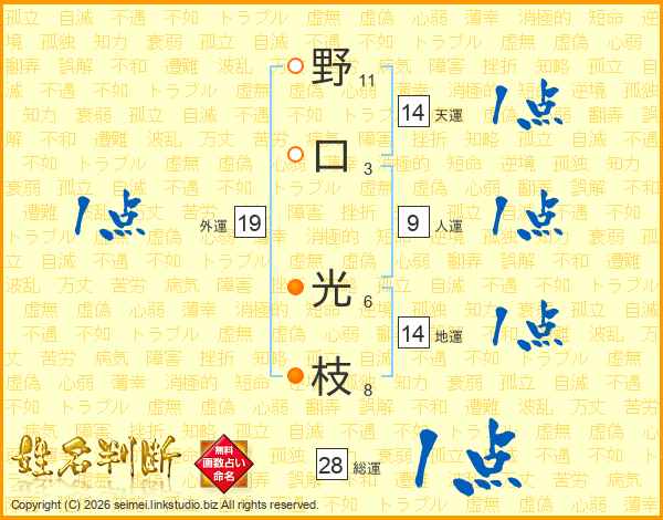 野(11画)口(3画) 光(6画)枝(8画)