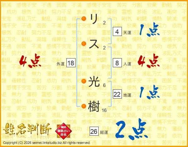 リ(2画)ス(2画) 光(6画)樹(16画)