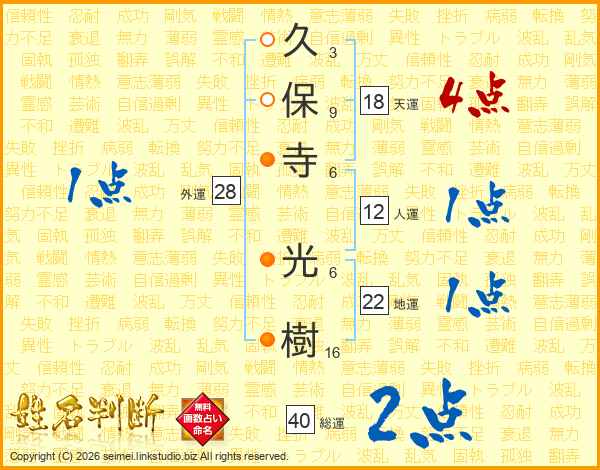 久(3画)保(9画)寺(6画) 光(6画)樹(16画)