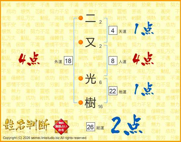 生活面を象徴する運勢です。外部から受ける影響力を表し、結婚運、家庭運や職場、環境への順応性を表します。総運から人運を引いた画数。姓や名が1文字の場合を除く。