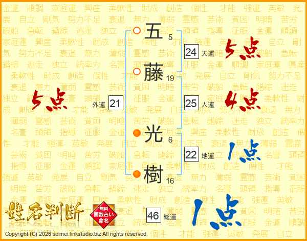 あなたの人生を表す1番重要な運勢です。生涯を通じて影響する総合運となり、主に50歳以降の晩年期に影響を及ぼします。苗字と名前の合計画数。