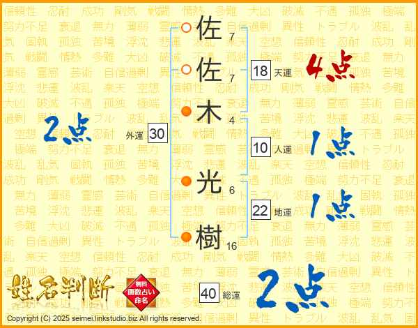 佐(7画)佐(7画)木(4画) 光(6画)樹(16画)