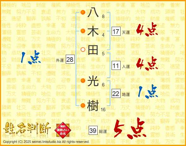 八(8画)木(4画)田(5画) 光(6画)樹(16画)