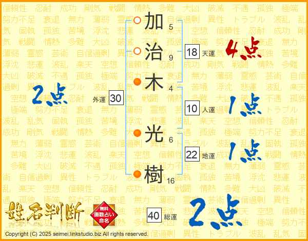 加(5画)治(9画)木(4画) 光(6画)樹(16画)