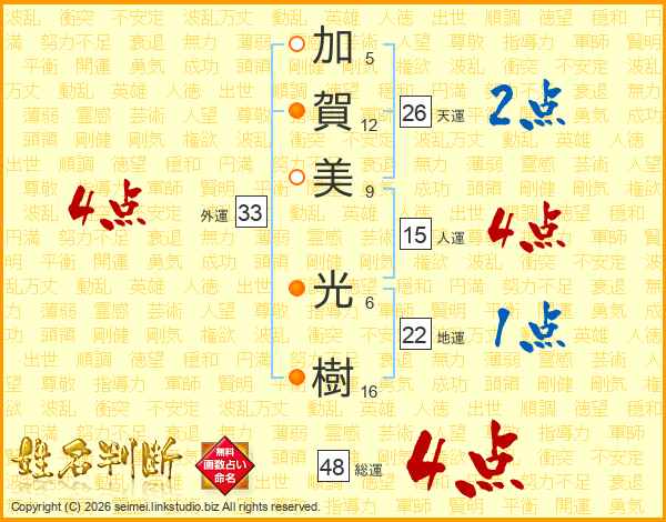 加(5画)賀(12画)美(9画) 光(6画)樹(16画)