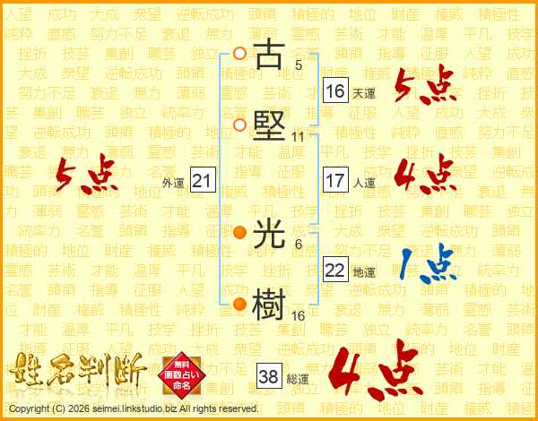 あなたの人生を表す1番重要な運勢です。生涯を通じて影響する総合運となり、主に50歳以降の晩年期に影響を及ぼします。苗字と名前の合計画数。