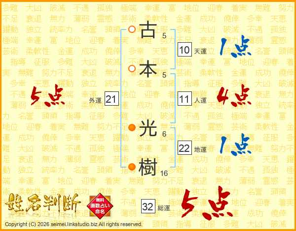 あなたの人生を表す1番重要な運勢です。生涯を通じて影響する総合運となり、主に50歳以降の晩年期に影響を及ぼします。苗字と名前の合計画数。