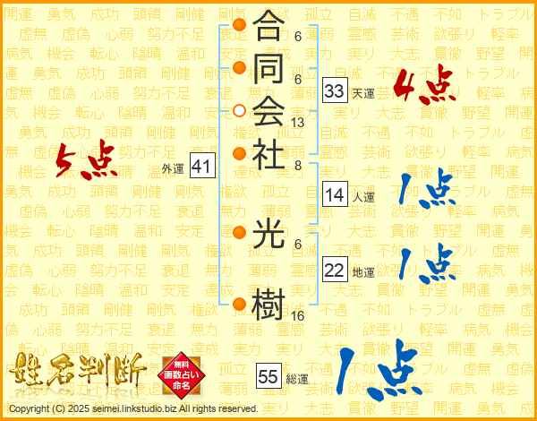 合(6画)同(6画)会(13画)社(8画) 光(6画)樹(16画)