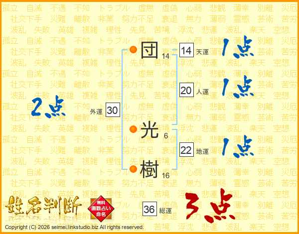 生活面を象徴する運勢です。外部から受ける影響力を表し、結婚運、家庭運や職場、環境への順応性を表します。総運から人運を引いた画数。姓や名が1文字の場合を除く。