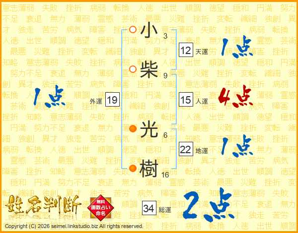 あなたの人生を表す1番重要な運勢です。生涯を通じて影響する総合運となり、主に50歳以降の晩年期に影響を及ぼします。苗字と名前の合計画数。