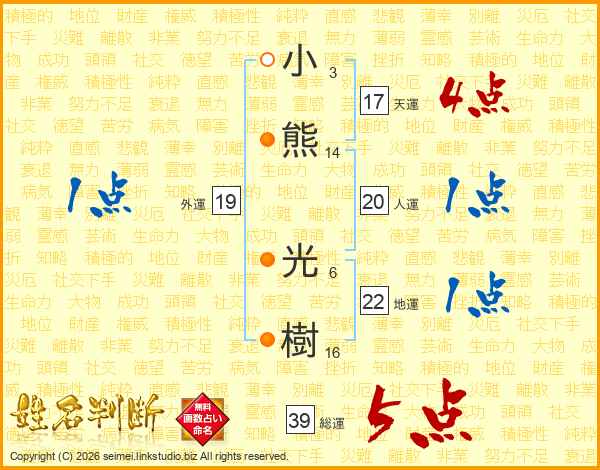 あなたの人生を表す1番重要な運勢です。生涯を通じて影響する総合運となり、主に50歳以降の晩年期に影響を及ぼします。苗字と名前の合計画数。