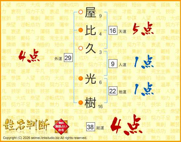 屋比久光樹さんの総運は38画の4点!